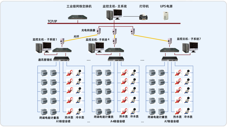 重慶廣達(dá)生活服務(wù)區(qū)能耗監(jiān)測(cè)系統(tǒng)采用網(wǎng)絡(luò)分布式結(jié)構(gòu),整個(gè)系統(tǒng)包括該建筑群的七個(gè)子系統(tǒng)和中心監(jiān)控室的一個(gè)總監(jiān)控系統(tǒng)。冷/熱水表數(shù)據(jù)和電表數(shù)據(jù)當(dāng)?shù)夭杉瓿珊蠹袀髦林行谋O(jiān)控室。 分控中心和中心監(jiān)控室之間用光纖網(wǎng)絡(luò)進(jìn)行通訊。每個(gè)子系統(tǒng)采用五臺(tái)通訊管理機(jī),其中三臺(tái)通訊管理機(jī)采集樓內(nèi)每戶(hù)的冷/熱水表數(shù)據(jù),另外兩臺(tái)采集樓內(nèi)電表的數(shù)據(jù)。