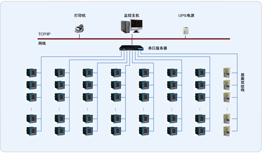 Acrel–2000軟件通過中間采集設(shè)備采集現(xiàn)場(chǎng)電力監(jiān)控儀表數(shù)據(jù),并在系統(tǒng)一次圖顯示出來。主要實(shí)現(xiàn)功能如:遠(yuǎn)程抄表查,詢各個(gè)配電室各個(gè)回路按照時(shí)間段進(jìn)行歷史數(shù)據(jù)查詢。趨勢(shì)曲線,功率實(shí)時(shí)趨勢(shì)顯示及歷史趨勢(shì)查詢功能。系統(tǒng)遙信狀態(tài)報(bào)警,根據(jù)本系統(tǒng)的設(shè)計(jì)意圖,如果重要回路或者照明回路三相中某一相電流負(fù)荷超過額定值的90%,系統(tǒng)必須立刻發(fā)出聲光報(bào)警并彈出指示框指明報(bào)警源,提醒管理人員注意負(fù)載的三相平衡和負(fù)載率,同時(shí)自動(dòng)記錄事件發(fā)生的時(shí)間和回路名稱,以便用戶查詢,追憶故障原因。